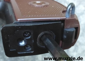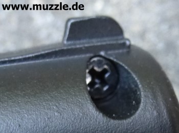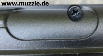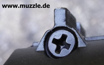 Bilder unten: Optisch wenig gelungen ist die Verschraubung der beiden Gehäusehälften. Entsprechende Kreuzschlitzschrauben sind unter Kimme und Korn, sowie im nur angedeuteten Hülsenauswurffenster zu sehen. Außerdem gibt es noch zwei identische Schrauben am Abzugsbügel