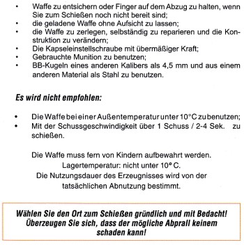 Geschossgeschwindigkeit (Vo): ca. 120 m/s (Herstellerangabe) Abzug: Spannabzug, Double Action Only (DAO) Abzugscharakteristik: Lauf: glatt (ohne Züge) Sicherung: Manueller Schwenkhebel linksseitig, unterbricht die Abzugsmechanik Visierung: Nicht justierbar (starr)