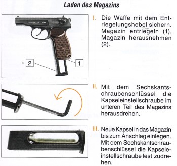 Kugelmagazin Um das Kugelmagazin entnehmen zu können, drückt man auf den Magazinhalter am Griffboden (Fotos unten).