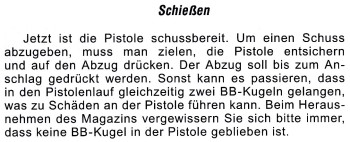 ------------------------------------------------------------------------------------------------------ ”Blow Back” - Dieser Begriff findet bei CO2- und Softair-Waffen Verwendung, wenn ein Teil des Treibgases bei Schussabgabe dazu verwendet wird, den Schlitten/Verschluss nach hinten zu bewegen, um den Rück- stoßimpuls, wie er beim Repetieren einer Feuerwaffe auftritt, zu simulieren. Dabei wird der Hahn oder das Schlagstück gespannt, wenn eine SA-Funktion gegeben ist. Die Waffe funktioniert also semiautomatisch. Double Action (DA) beschreibt einen sogenannten Spannabzug von Selbstladewaffen, bei dem der Abzug das Schloß (Hahn oder Schlagstück) spannt und dann bei weiterem Durchziehen den Schuss auslöst. Bei einem Re- volver wird auch die Trommel um eine Kammer weitergedreht. Double Action Only (DAO) bedeutet, dass man die Waffe nicht vorspannen kann, also kein Single-Action-Modus möglich ist. Single Action (SA) bedeutet, dass man den Hahn (oder ein Schlagstück) spannt, bevor man den Abzug betä- tigt. Der Abzug führt also nur noch eine Aktion durch, nämlich das Auslösen des Schusses. Vorteil: Der Abzugswiderstand wird geringer und der Abzugsweg kürzer, was der Schusspräzision zugute kommt. ------------------------------------------------------------------------------------------------------------------------
