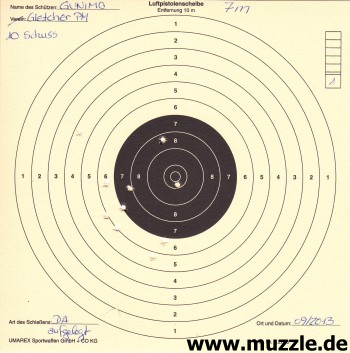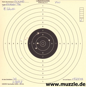 Fazit Die “Gletcher PM” machte bei den Testdurchgängen auf dem Schießstand keine Probleme und arbeitete stets zuverlässig. Die für das Plinking ausgelegte und einfach ausgestattete NBB-Pistole offenbart die eine oder andere Schwäche und macht im praktischen Gebrauch nur dann Spaß, wenn man keine überzogenen Anforderungen an Präzision und Komfort stellt. Betrachtet man einige optisch wenig gelungene Detaillösungen wie z. B. die auffällige Gehäuseverschraubung und legt den Fokus auf den Komfortaspekt, ist die “Gletcher PM” nur für den genügsamen Anwender im Bereich des Funshootings eine akzeptable Option. Bei einer Neu- preisspanne von 95,- bis 140,- (Recherche September 2013), lohnt sich ein Preisvergleich (Preis-Leistungs- Verhältnis) ebenso, wie die Beschäftigung mit den im Handel befindlichen Alternativen. GUNIMO Oktober 2013