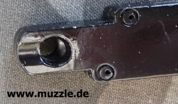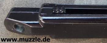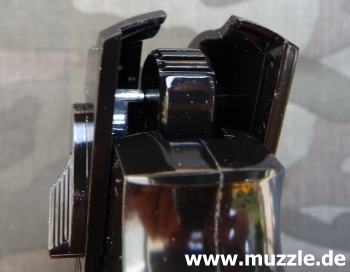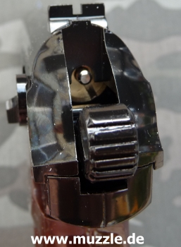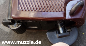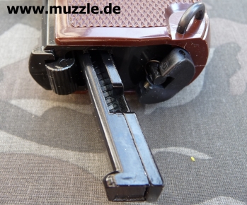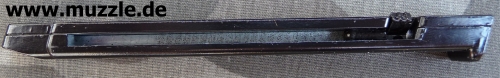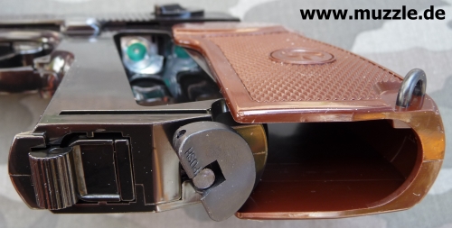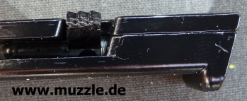 fungiert dabei originalgetreu als Zerlegehebel. Zieht man diesen nach unten aus dem Gehäuse heraus, kann der Schlitten ganz nach hinten gezogen und nach oben abgehoben werden (Bilder unten).