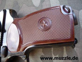 Ausführung: Vollmetall (Druckguss), schwarz beschichtet - braune Kunststoffgriffschalen