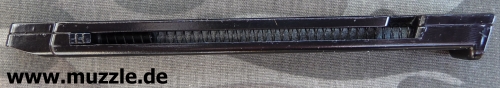 Das Stabmagazin für 18 BBs ist ein stabiles, massives Metallbauteil. Beim Betätigen des Magazinhalters am