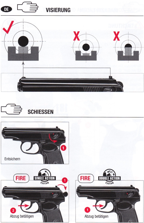 Action). Dies kann entweder direkt per Daumen am Hahn erfolgen, oder auch mittels Zurückziehen des beweg- lichen Schlittens. Eine “Blow-Back”-Funktion ist bei dieser Waffe nicht gegeben.
