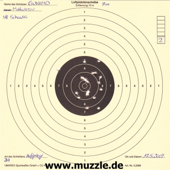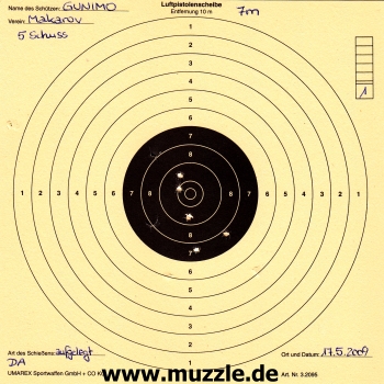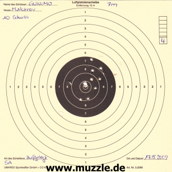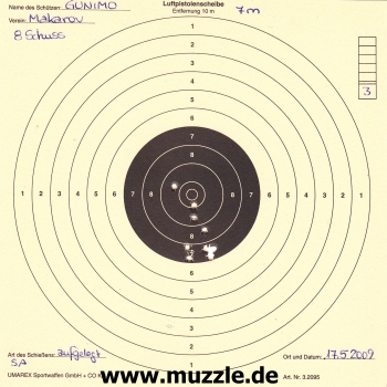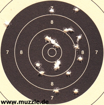 einer Freizeitwaffe dieser Ausprägung auch nicht zu erwarten war. Auf 7 m Schussdistanz lässt sich aber der schwarze Spiegel einer 10-m-LP-Scheibe zuverlässig treffen (siehe Scheiben unten). Ausreißer waren bei den