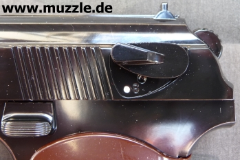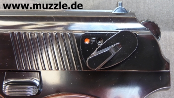 Sicherung: Schwenkhebel linksseitig am Schlitten blockiert die Abzugsmechanik