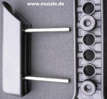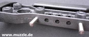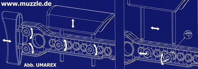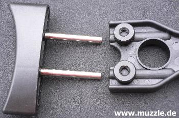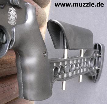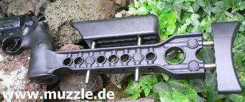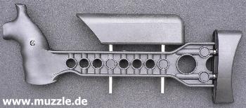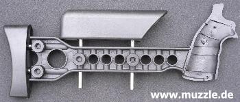 Der Anschlagschaft wird anstelle der linken Griffschale mit einer Schraube an das Griffstück angesetzt. Er ist sehr variabel (Länge, Schaftbackenhöhe und -position) und leicht verstellbar, sodass man schnell seine indiviuell optimale Einstellung erreicht.