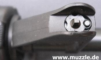 Visierung mit der etwas gewöhnungsbedürftigen Lochkimme zum Einsatz kam (Abb. siehe Review). Ein Red-Dot oder Zielfernrohr auf der Picatinny-Schiene ist nicht ohne weiteres Einsatzbar, da der hohe Kornträger
