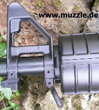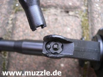 Schlüssel passgenau hineinstecken lässt. (Bilder unten) - Für den Transport oder die Lagerung der Waffe eine brauchbare Verstaumöglichkeit. Beim Schießen muss er natürlich dann wieder entfernt werden, da er im Weg ist.