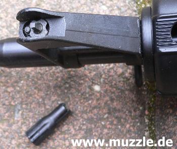 Waffe bei. Er hat aber ein praktisches Manko: Er ist relativ klein und kann daher leicht verloren gehen. Leider hat er keine Öse oder Bohrung, so dass man ihn dann unter Verwendung eines Bindfadens an der Waffe