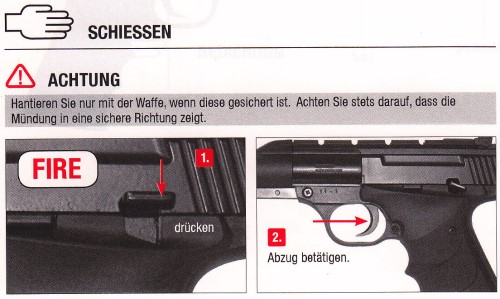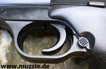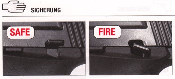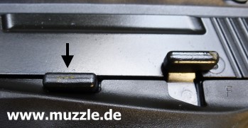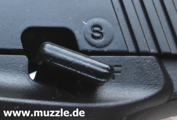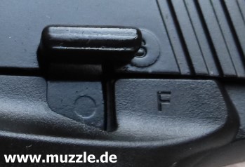 Sicherung Die “Buck Mark URX”-Luftpistole ist mit einer manuellen Sicherung ausgestattet. Sie befindet sich oberhalb des Griffstücks auf der linken Seite der Waffe. In Position “S” für “safe” (sicher) wird die Abzugsmechanik blockiert. Spannt man die Waffe durch knicken des Laufs, wird sie dabei automatisch gesichert, der Hebel bewegt sich dann von Position “F” (fire) nach “S”. Vor der Schussabgabe muss die Sicherung also jeweils wieder manuell deaktiviert werden (Fotos unten).