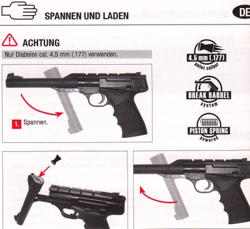 Kaliber: 4,5 mm (.177), Diabolo Magazinkapazität: Einzellader System: Knicklauf, Federdruck Energie max.: 2 Joule (Herstellerangabe) Geschossgeschwindigkeit: 90 m/s (Herstellerangabe)