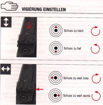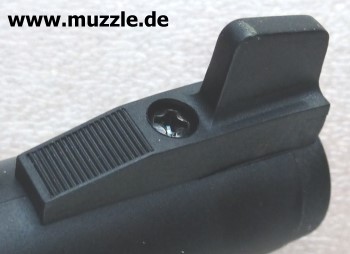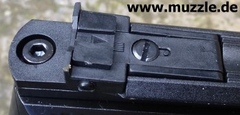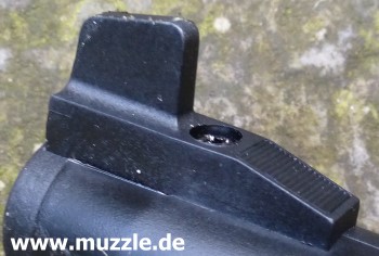 Die Kimme der “URX” ist sowohl höhen- als auch seitenverstellbar. Sie generiert einen recht guten Kontrast, allerdings könnte der Kimmenausschnitt gerne auch tiefer sein. Für meinen Gechmack ist dieser etwas zu flach ausgefallen. Mittels zweier Schlitzschrauben lässt sich die Kimme durchaus präziese justieren (Bilder unten).