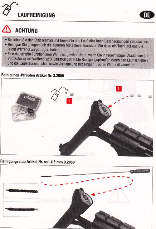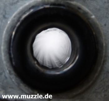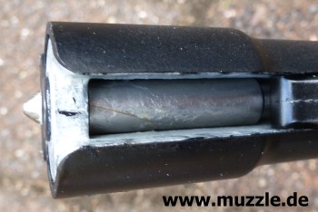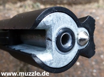 Als Laufarretierung dient ein federbelasteter, spitz zulaufender, zylindrischer Einsatz aus einer nicht magnetischen Metalllegierung über dem Laufeingang. Der gezogene Stahllauf sitzt nicht zentriert im Laufmantel, sondern etwas nach oben versetzt. Die Laufeinfassung besteht aus Druckguss und ist ihrerseits mit schwarzem Kunststoff ummantelt. Dadurch wird beim Anfassen keine Abnutzung durch Handschweiß und mechanischen Abrieb entstehen, wie sie z. B. bei brünierten oder lackierten Oberflächen auftritt.