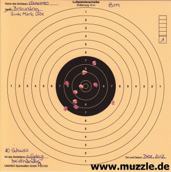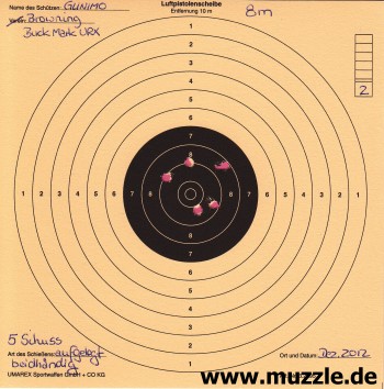 Fazit Mit der “Browning Buck Mark URX” steht am Markt eine handliche und führige Federdruck-Pistole bereit, die das Segment der Look-Alike-Waffen bereichert. Die Pistole kann im Bezug auf ihr leichtgängiges Handling ebenso punkten wie im Bereich der Praxistauglichkeit auf dem Freizeitschießstand. Für rund 50,- EUR Einsatz bekommt man einen adäquaten Gegenwert in die Hand, der sich wohltuend vom Einheitsbrei abzuheben vermag. Der leichte Spannvorgang in Verbindung mit der insgesamt guten Handlichkeit dieser kompakten Kurzwaffe, macht sie m. E. auch für jugendliche und/oder weibliche Hobbyschützen besonders interessant, die erfahrungsgemäß mit den hohen Kraftaufwand fordernden Knickern so ihre Mühe haben und deshalb nach wenigen Spannvorgängen die Lust am Schießen verlieren. Das steht hier nicht zu befürchten. GUNIMO Dezember 2012