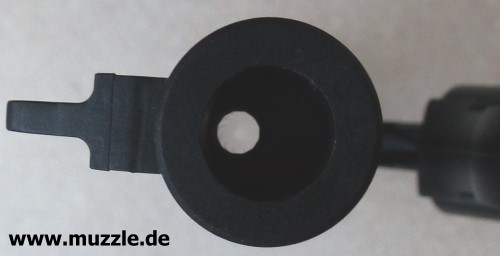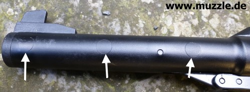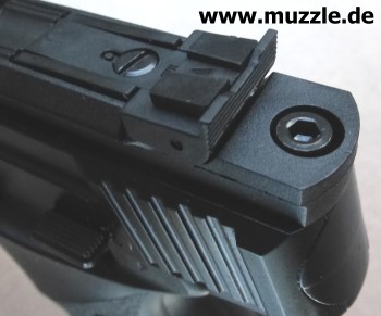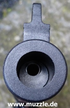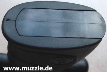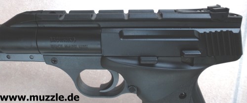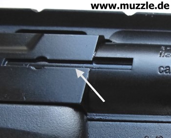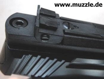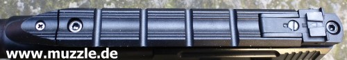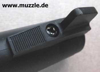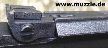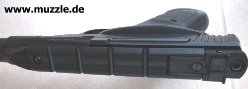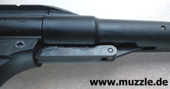 Wer eine optische Zielhilfe montieren möchten hat dazu Gelegenheit, denn auf dem System sitzt eine Montage-Rail (Kunststoffschiene) mit Weaver-Profil (Fotos unten).