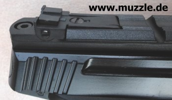 Wie bereits weiter oben erwähnt, generiert die “URX” ein etwas gewöhnungsbedürftiges Abzugsverhalten. Nach dem Spannen, Laden und Entsichern nimmt der Abzugsfinger sofort den kräftigen Druckpunkt war. Die Pistole bietet weder einen Vorzugs-, noch einen Nachzugsweg. Der Schuss löst trocken aus. Hat man sich aber erst mal an diese Umstände gewöhnt, kommt man ganz gut damit zurecht, auch wenn das natürlich keine als optimal zu bezeichnende Charakteristik darstellt. Aber man sollte stets bedenken, dass die “URX” eine preiswerte Hobby- und Freizeitpistole ist und keine hochpreisige Matchwaffe. Und in diesem Kontext gibt es auch an der offenen Visierung nicht viel zu kritisieren, die sowohl höhen- als auch seitenverstellbar ist und einen ausreichend guten Kontrast hergibt. Ebenso darf man den Sicherheitsaspekt postiv hervorheben, den der beim Spannvorgang automatisch einrastende, manuelle Sicherungshebel bietet.