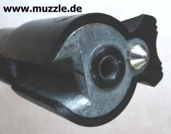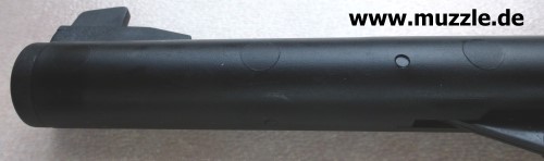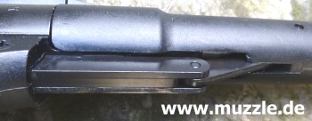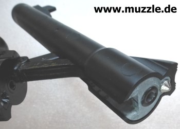 Fotos oben und unten: Der Lauf dient, wie bei “Knickern” üblich, als Spannhebel um die Feder im Kompressionsraum zu spannen. Der Spannvorgang ist relativ leichtgängig, da kein sehr starker Federwiderstand entgegengesetzt wird. Das hohe Balkenkorn auf seinem Sockel über der Mündung stört zwar ein wenig beim Zufassen, ist aber nicht spitz oder scharfkantig. Handverletzungen sind somit nicht wirklich zu befürchten.