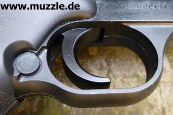 Look-Alike: Die “Buck Mark URX” ist in vielen kleinen Details ihrem realen Vorbild optisch nachempfunden. So fehlen weder die Auszieherkralle (Pfeil, Fotos oben), noch der Schlittenfanghebel (Bild unten rechts) oder der Magazinknopf hinter dem Abzugszüngel (Foto unten links). An der Luftpistole natürlich reine Fakes.