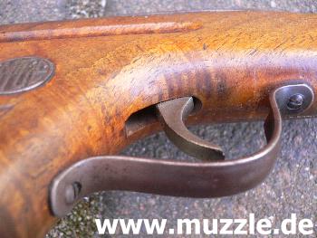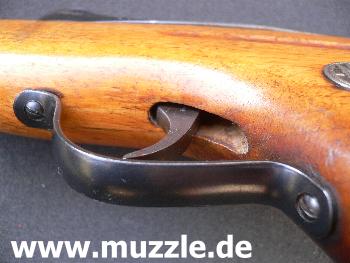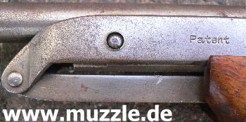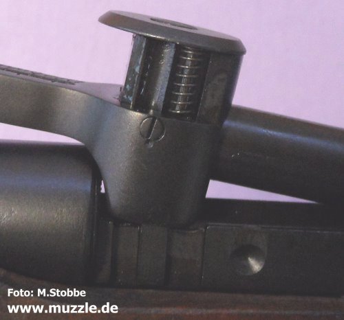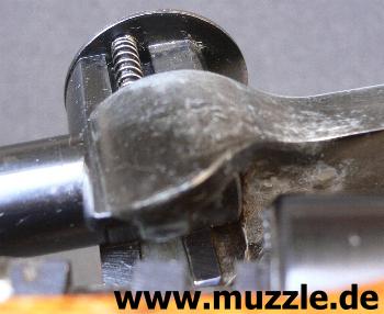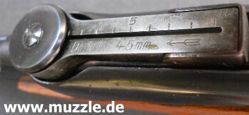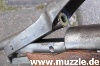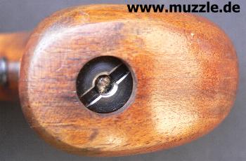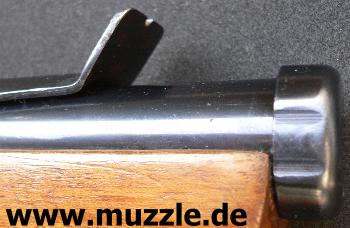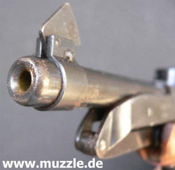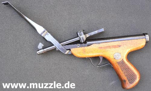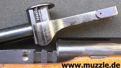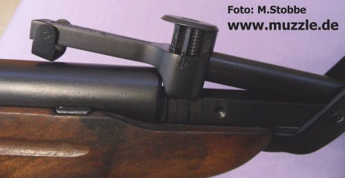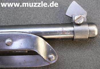 Die “Zenit” ist ein sogenannter “Top-Lever-Spanner”. Der Spannhebel, dessen Ende als Kimme ausgeführt ist, wird “über Kopf” nach vorne geschwenkt und wieder zurück geführt. (Bild oben) Offene Visierung Einzellader
