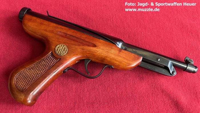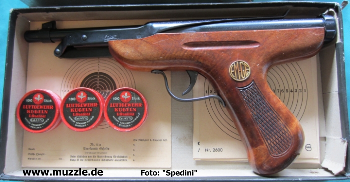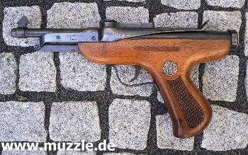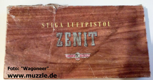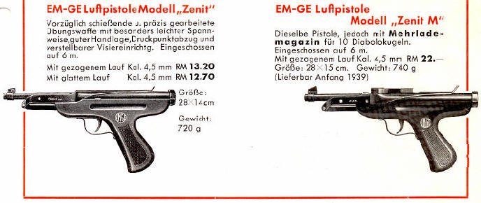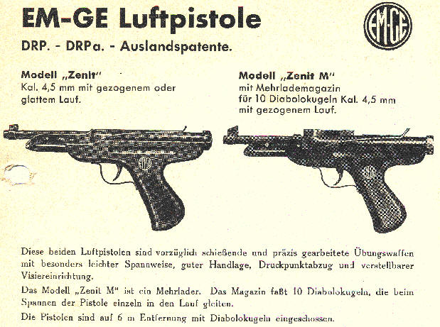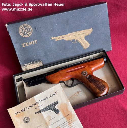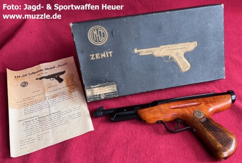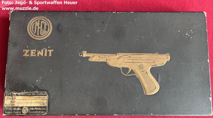 Die Geschichte der Waffenfabrik “Moritz & Gerstenberger” begann 1927 zunächst als lose Zusammenarbeit zwischen Heinrich Mortitz und Albin Gerstenberger. Moritz war seit 1916 mit der Handelsmarke “HeiMo” präsent. Die Marke “EM-GE” wurde 1927 registriert und erhielt am 1.10.1928 die rechtliche Anerkenung. Etwa um 1930 begann man mit der Fertigung von Druckluftwaffen. Die “Zenit” erschien 1936. Bei der Pistole handelt es sich um ein sauber verarbeitetes Produkt mit interessanten Detaillösungen, jedoch ist die beim Schuss erzeugte Energie recht mäßig.