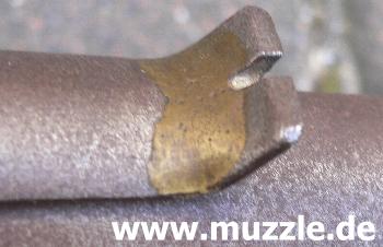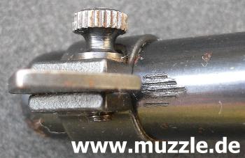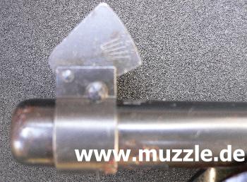 Während der Einzellader, offensichtlich das ältere Exemplar der beiden Schestermodelle, noch über ein statisches Korn einfachster Ausprägung verfügt, ist der Mehrlader bereits mit einem horizontal sowie vertikal justierbaren und mit Markierungen versehenen Korn bestückt. Als Kimme wird bei beiden Modellen lediglich das hochgebogene und geschlitzte Ende des Spannhebels verwendet. Bilder unten: Detailansichten der “Zenit” (Einzellader)