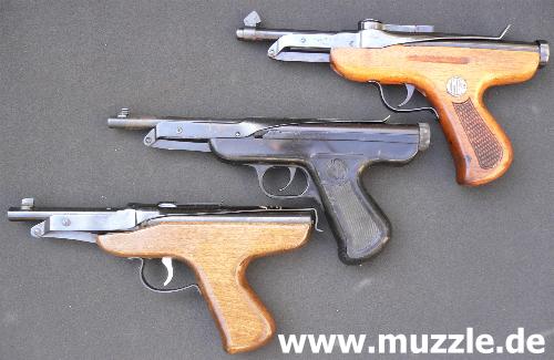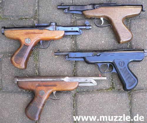 Bilder unten, jeweils von oben: “Milbro Mark IV”, “GM Zenit” mit schwarzem Kunststoffgriff, “EM-GE Zenit M“, EM-GE Zenit” (Einzellader)