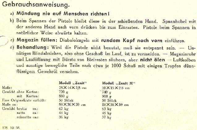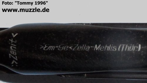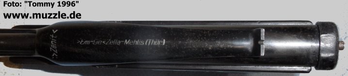 Hersteller: Moritz & Gerstenberger Waffenfabrik, Zella-Mehlis, Thüringen, Deutschland Patent: # 644.748 vom 2.1.1936 - Franz Möller, Zella-Mehlis Modelle: “Zenit” / “Zenit M” (“M” für Mehrlader) - entsprechend wird die Bezeichnung “E” hier für Einzellader verwendet. Seriennummern: -keine- System: Federdruck, Top-Lever-Spanner Kaliber: 4,5 mm (Diabolo)