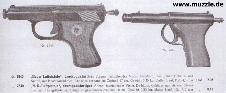 Hersteller: Friedrich Wilhelm Heym GmbH & Co. KG, Münnerstadt, Deutschland System: Laufspanner (push-barrel), Federdruck Kaliber: 4,5 mm Kapazität: Einzellader für Diabolos oder Darts Visierung: starr, nicht justierbar Ausführung: Systemgehäuse Druckguss, schwarz lackiert, Lauf Stahl Griffsschalen: hellbrauner Kunststoff Länge entlastet: 198 mm Länge gespannt: 165 mm Lauflänge: 120 mm (4,75”) Gewicht: 320 g Fertigungszeitraum: 1949 - ca. 1956 Markierungen: System unbeschriftet, nur die linke Griffschale mit dem “Heym”-Logo versehen. Bewertung: Die Pistole ist zwar nicht als Topp-Rarität einzustufen, aber andererseits auch keine Massenware. Für Sammler durchaus interessantes Stück, obwohl keine Besonderheiten oder Variationen bekannt sind.