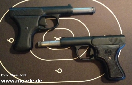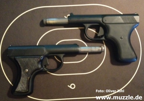 “Heym”-Luftpistole und unbekannter Klon: Fotos unten: Auf den beiden u. g. Bildern ist jeweils unten eine “Heym”-Luftpistole im modernerem “Gewand” zu sehen. Auf der linken Griffschale befindet sich entsprechend das Firmenlogo. Die obere, baugleiche Pistole eines unbekanten Herstellers ähnelt der “Heym”-Pistole sehr stark, hat aber andere Griffschalen, eine höhere offene Visierung und verfügt über keinerlei Beschriftung.