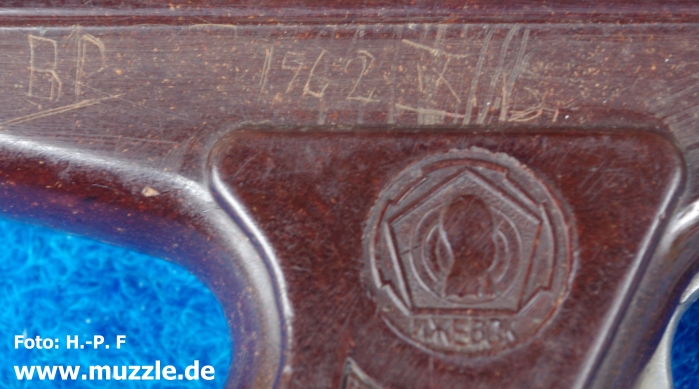 Bei der vorliegenden Druckluftpistole handelt es sich ohne Zweifel um eine russische Kopie der “EM-GE Zenit” (Zella-Mehlis), Kaliber 4,5 mm. Herkunft: Ischewsk (russisch: Ижевск) = Hauptstadt der Teilrepublik Udmurtien in Russland, siehe Schriftzug unter dem Fünfeck auf dem Griffstück.