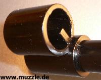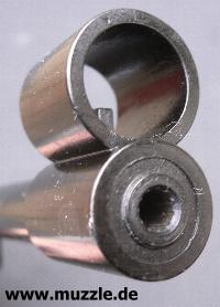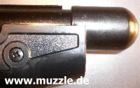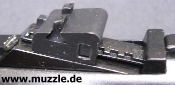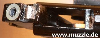 Griffstück gelagert. Es hat etwa 5 Millimeter Spiel. Die Detailbilder unten zeigen die Bewegung, wenn man das System mit der Hand auf dem Griffstück nach hinten schiebt.