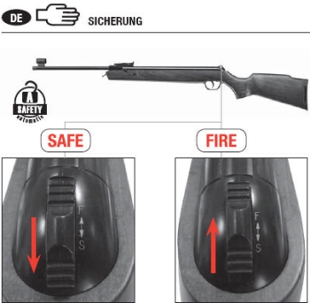 Position “S” (Safe) geschoben wird. Nach dem Spannen ist die Waffe automatisch gesichert und muss vor Schussabgabe manuell entsichert werden.
