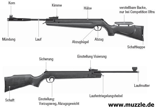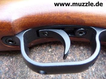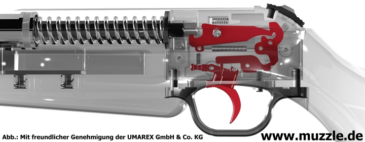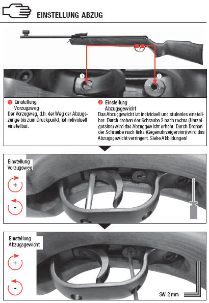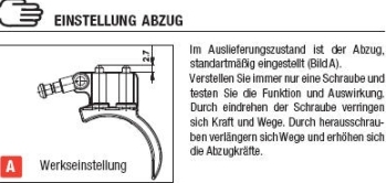 geringe Masse und löst sehr sehr leicht und trocken aus. Einen sogenanten “Tunigabzug” aus Metall gibt es als Zubehörteil. Bei diesem kann man zusätzlich auch noch den Rastenübergriff einstellen. Die Justierung ist