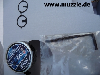 Inbusschlüssels bei Bedarf komplett entfernt werden. Im Lieferumfang enthalten sind drei Wechselkornblätter. Dreht man die Kornschraube weit genug heraus, kann der jeweilige Kornblatteinsatz aus dem Schlitz im