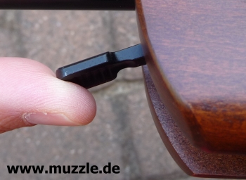 Fotos unten: Der metallene Sicherungsschieber am System blockiert die Abzugsmechanik, wenn dieser in die