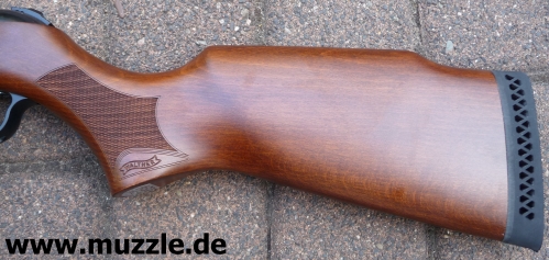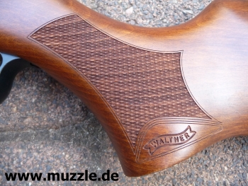 Fotos unten: Version “Walther LGV Master” mit gebeitztem und lackiertem Buchenholzschaft, der im Bereich