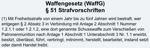 Anlage 1 Ziffer 1.2) grundsätzlich eine Erlaubnis benötigt. Diese Legitimation heißt „Waffenschein“. Wer eine Waffe ohne die erforderliche Erlaubnis führt, begeht eine Straftat, für die laut § 52 WaffG bis zu drei Jahre