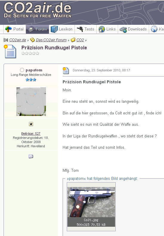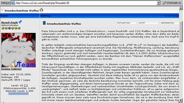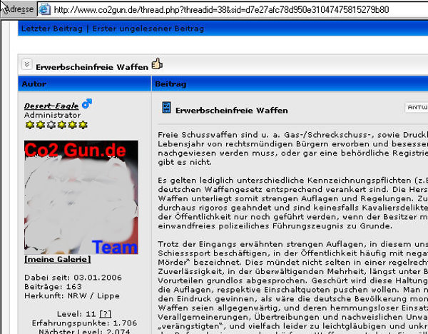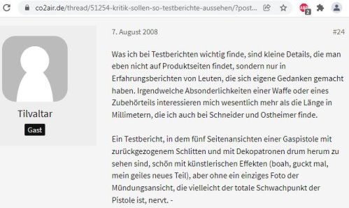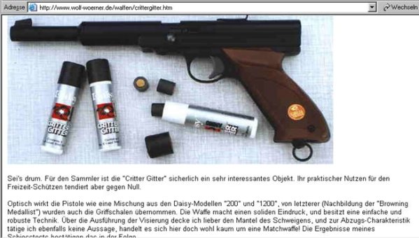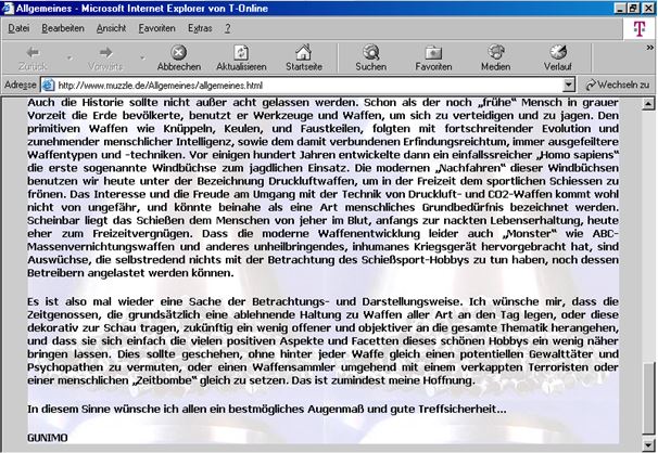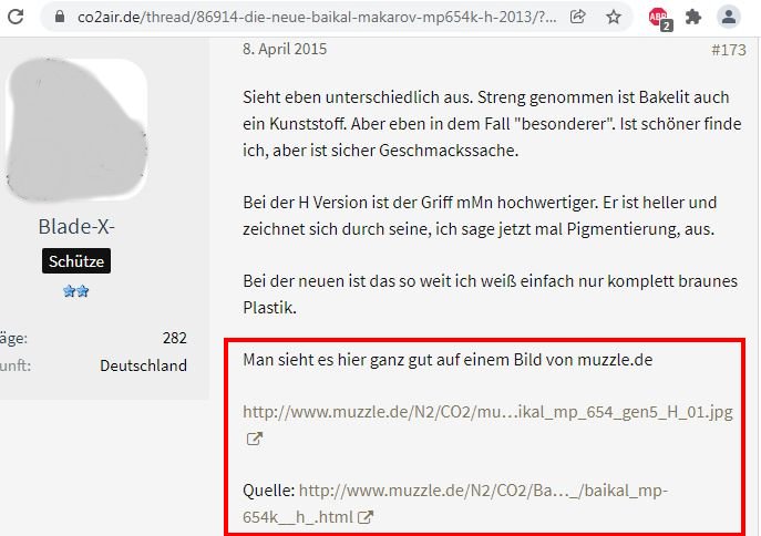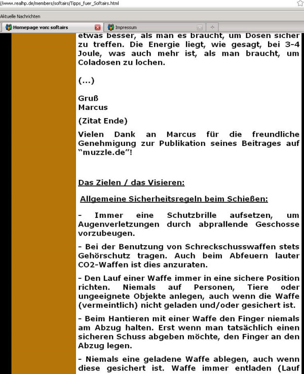 Urheberrechtsverstöße - Bilder- und Textdiebstahl Ich werde von Zeit zu Zeit immer mal wieder freundlich angefragt, ob bestimmte Fotos von meiner Website für ein Projekt übernommen und anderweitig verwendet werden dürfen. In der Regel stimme ich solchen Anfragen zu. Vor allem dann, wenn es sich um eine eng umgrenzte und private, bzw. nicht kommerzielle Verwendung handelt. Als einzige Gegenleistung bitte ich mir dann einen Quellenhinweis aus. Allerdings habe ich bereits viele Verstöße im Netz entdeckt, bei denen Fotos, Textpassagen oder auch ganze Reviews unauthorisiert von meiner Homepage entnommen und auf anderen Präsenzen dreist und ungeniert eingesetzt werden. Selbst wenn dabei hin und wieder auch ein Quellenverweis oder ein Link dazu gesetzt werden gilt: Die Verwendung von Fotos und Textpassagen ist ohne meine explizite Zustimmung von mir unerwünscht und stellt einen Verstoß gegen das Urheberrecht dar. Wer informativ auf eine “muzzle.de”-Seite hinweisen möchte, kann dies jederzeit gerne mit einem Link tun. Natürlich gehören sogenannte “Hotlinks” nicht dazu! Fast regelmäßig, oder zumindest recht häufig, stelle ich solche Verstöße bei der Online-Auktionsplattform “egun.de” fest, ebenso hin und wieder im Diskussionsforum “co2air.de”, u. a.. Bei “egun.de” werden meist die Waffenbeschreibungen mit technischen Daten 1:1 aus meinen Reviews entnommen und per “copy and paste” in die Auktionen eingefügt. Oft macht sich der Warenanbieter nicht einmal die Mühe die Seriennummern meines Waffenexemplars aus dem Text zu löschen oder durch die, der zum Verkauf stehenden Waffe zu ersetzen. Manchmal, bei besonders dreister Vorgehensweise, kommen auch Fotos meiner Waffen zur Verwendung, bis hin zur Wiedergabe eines fast kompletten Reviews als Auktionstext zur Waffenbeschreibung. Kein Scherz! - Oft sind es andere “egun”-Nutzer, die mich per eMail auf diese Umstände hinweisen. Bei “co2air.de”-Forum werden ab und an Fotos von “muzzle.de” in einschlägige Threads eingebunden und von den Moderatoren unwidersprochen dort belassen. Auch hier gilt: Ein Link auf einen Artikel oder ein Foto sind absolut o. k. und von mir sogar gerne gesehen - Das Hochladen und Einfügen meiner Fotos, bzw. die “Hotlink”-Setzung auf Bilder sind nicht in meinem Sinne! Hier besteht der Anspruch auf Exklusivität. Ich denke, das sollte verständlich sein, denn das Erstellen von Reviews mit vielen Fotos und ausführlichen Texten nebst Recherchearbeiten ist eine sehr zeitaufwändige Angelegenheit! Siehe unten...