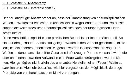Das heißt weiterhin: Alle auf LEP umgebauten, vormals “scharfen Waffen”, werden der selben Erlaubnispflicht wie diese Feuerwaffen gleich gestellt. Ergo: Waffenbesitzkarteneintrag (WBK) mit entsprechenden amtlichen Gebühren und Aufbewahrungspflichten. Mit Sicherheit das Ende der LEP-Modifikationen! - Altbesitz- Regelung???