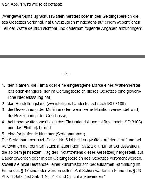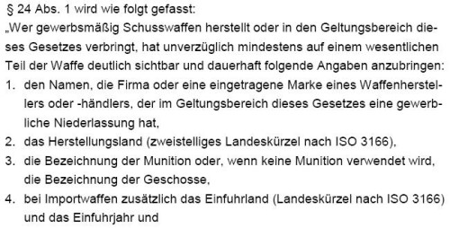 Nun ist bei der erweiterten Kennzeichnungspflicht explizit nur noch von “scharfen” Schusswaffen die Rede. Gas-/ Schreckschusswaffen sind offenbar nicht mehr davon betroffen: