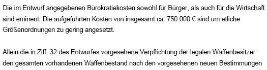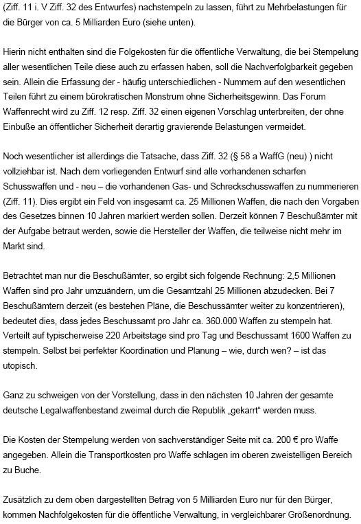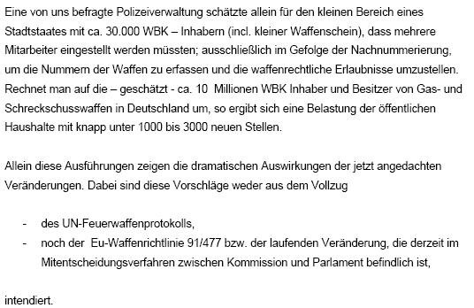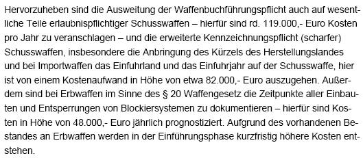 Die durch Sachverständige geschätzten Kosten schlagen pro Waffe mit rund 200,- € zu Buche! – Im Hinblick auf den Wert einer gängigen Schreckschusswaffe (50 – 150,- €) würde dies quasi den wirtschaftlichen Totalschaden bedeuten. Welcher Besitzer einer solchen Waffe wäre dann zur Nachkennzeichnung bereit?