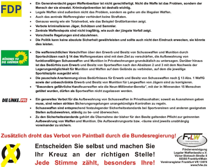 Die zuständigen Behörden dürfen nun völlig verdachtsunabhängig die Aufbewahrungsorte von Waffen und Munition besichtigen, also quasi nach Gutdünken die Wohnungen unbescholtener Bürger aufsuchen und kontrollieren. Gegen die Stimmen der FDP hat der Bundestag im Juni 2009 die Waffengesetzverschärfungen verabschiedet.