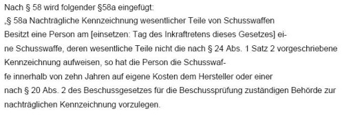 In §58 ist auch nicht mehr von einer NACHTRÄGLICHEN Kennzeichnungspflicht die Rede, sondern die Regelung betrifft wohl ausschließlich Neuemissionen von Schusswaffen durch Hersteller/Importeure ab dem Inkraft- treten der WaffG.-Neuregelung: