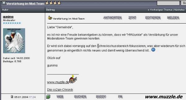 “HWJunkie” das Amt des Moderators, mit Schwerpunkt auf seinem Spezial- und Sammelgebiet Schreckschusswaffen. Bild unten: Nachricht im Forum “co2air-intern”.