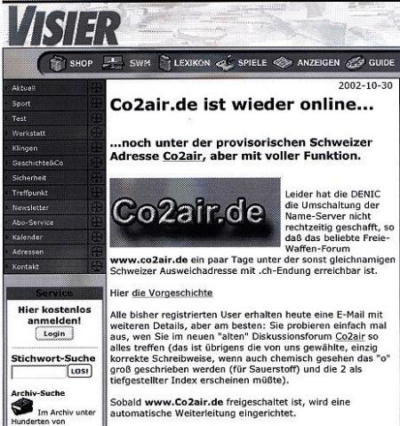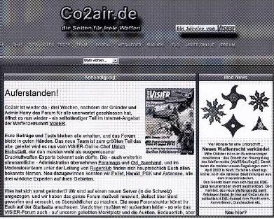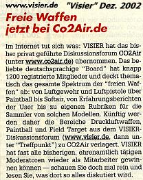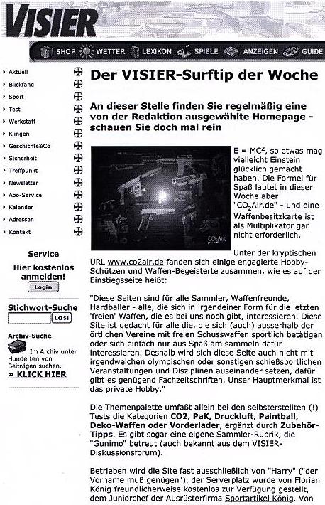 Im Dezember verzeichnete die Waffenfachzeitschrift „Visier“ ihren Online auftritt. Harry und ich (UserNr.20) hatten sich dort unmittelbar nach der Öffnung registriert. Sozusagen „gleich nach der Putzfrau“ (wie der dortige Admin zu scherzen pflegte). In unseren Signaturen führten wir gleich die URL von co2air.de (Werbung muss sein ;-) ), so wie ich es auch bei „Waffen-Online“ schon tat. Dies führte durchaus dazu, dass der eine oder andere User dieser Boards mal bei uns vorbei schaute... meistens meldeten sich die Leute ja unter dem gleichen Nick überall an, daher konnte man schon etwas ableiten. Im Januar 2001 erscheint eine neue Rubrik, die Fachliteraturempfehlungen zum Inhalt hatte.