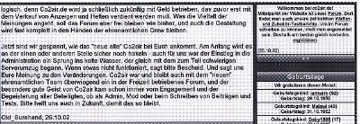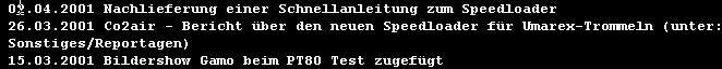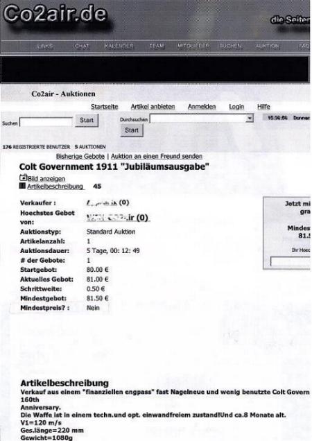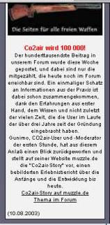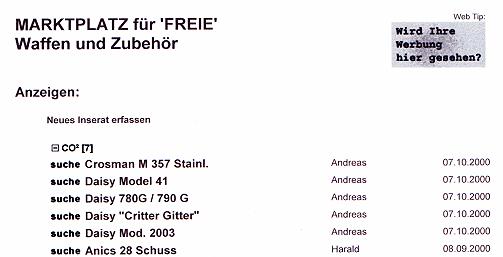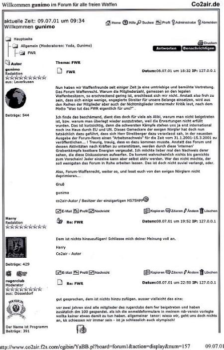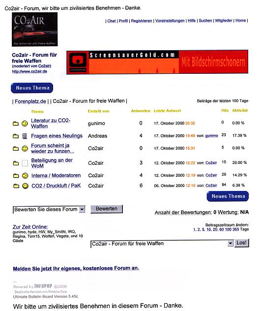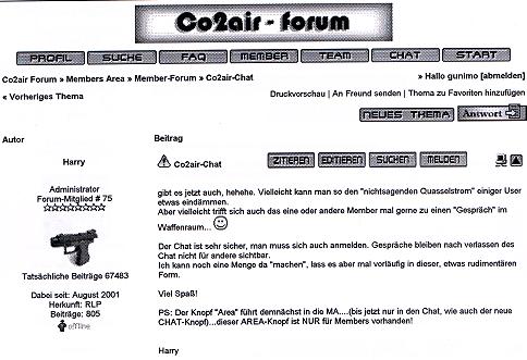 Im angegliederten Diskussionsforum („forenplatz.de“) tat sich zu jener Zeit wenig bis gar nichts. Wer posten wollte, musste sich hier zunächst registrieren. Anders in der sogenannten „Meckerecke“, die bei „forumromanum.de“ gehostet war. Hier konnte jeder ohne Anmeldung Kritik und Anregungen los werden. Harry kalkulierte damit, dass dadurch die Hemmschwelle ein paar Zeilen zu schreiben geringer wäre, und er wollte alles was nicht direkt Waffenbezug hatte, aus dem Diskussionsforum fernhalten. Eine weitere Komponente der „Co2air“-Seiten war der eigene „Marktplatz“. In diesem Forum von „mastertools.ch“ konnte jeder User kosten- und gebührenfrei Inserate schalten. 19.10.2000: