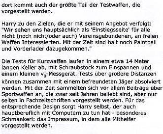 „Harry“ und „Anon“, welcher ebenfalls an Freien Waffen interessiert war, begannen damit, die Waffen des eigenen Bestandes sukzessive zu testen, Berichte zu verfassen und damit die Website zu erweitern. Die Kandidaten wurden mittels Punktesystem bewertet und in einer tabellarischen Auflistung geführt. Andruck 5.10.2000 (Autor “Anon”):