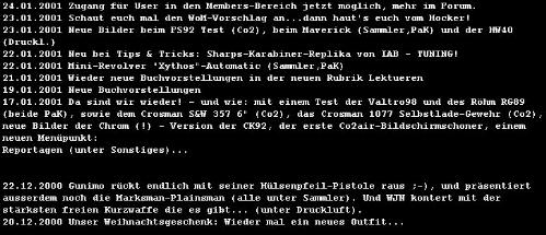 Am 21. November 2000 trat „Harry“ mit dem Angebot an mich heran, ich solle als Moderator das Team verstärken und eine „Sammler-Rubrik“ aufbauen, sowie den „Dekowaffen“-Bereich beleben. Im Forum war ich ja sowie bereits omnipräsent. Ich freute mich sehr über dieses Angebot und sagte bereits am nächsten Tag meine Mitarbeit zu. Als Teammitglied erhielt ich eine eigene Forward-Mailadresse und fand unmittelbar Erwähnung im Impressum der Website. Natürlich erhielt ich im Forum nun den offiziellen Moderatoren-Status. Das war eh nur noch eine Formalität, da ich dort quasi inoffiziell ohnehin schon moderiert hatte. Die erste Waffe, die ich in ‚meiner’ neuen Sammler-Rubrik vorstellte war die Smith&Wesson 78G/79G- CO2-Pistole. Ich hatte „Harry“ den Bericht und etliche Fotos per Mail überspielt. Die gesamten administrativen Arbeiten machte „Harry“. Er musste den Bericht präsentationsfertig machen und am 28.11.2000 ging die Eröffnung der neuen Rubrik offiziell in die News-Liste ein. Im November und Dezember 2000 stießen dann u. a. zwei höchst engagierte User zum Forum. Zwei Namen, die heute zum Moderatorenkreis des Forums gehören und bestens bekannt sein dürften. „WJN“ hatte Fragen zum Daisy44-Revolver und bei „Rugerclub“ lag kurzeitige „Unwissenheit“ um den Begriff „WoM“ vor. In seiner Signatur prangte stets die URL seiner eigenen Website. ;-) Harry fand große Freude daran, das Board immer weiter zu optimieren und das Layout zu verändern. Im Dezember 2000 hatte er eine umfangreiche Renovierung durchgeführt. Das Startbild erschien mit Flammendekor und die „Meckerecke“, das eigenständige Miniforum, verschwand. Motto: „Wer was zu meckern hat, soll’s halt im Forum tun...oder per Mail“. Eines darf natürlich hier nicht unerwähnt bleiben: Ein Kleinod deutscher Ingenieurkunst und eine Rarität der Waffentechnik im Allgemeinen, wurde am 22.12.2000 in der Sammler-Rubrik der Öffentlichkeit vorgestellt. Die „Hülsenpfeilpistole“! ;-) – Diese Bezeichnung wurde schnell zu einer Art geflügeltem Wort unter den Forenteilnehmern und war mehrfach Gegenstand witziger Frotzeleien und natürlich der „WoM“-Wahl. Das ich immer wieder auf diese Pistole angesprochen wurde, veranlasste mich dann irgendwann dazu, mich in meiner Signatur als: „Besitzer der einzigartigen HS75HPP“ auszuweisen. (HPP steht natürlich für „Hülsenpfeilpistole“). Ende Dezember 2000 hatte die Website rund 17.000 Hits verzeichnet, aber die Posting-Beteiligung war noch nicht so recht in Schwung gekommen. An der WoM-Wahl des Vormonats hatten sich insgesamt nicht mehr als 30 Leute beteiligt. Es gab nicht täglich neue Postings und die Zahl der „Oft-Poster“ lag bei < 10 Leuten. - „Harry“ vermutete in diesem Zusammenhang eine Art Teufelskreis: Vorbeisurfende denken von einem kleinen Board „hier lohnt das Posten nicht“, und deshalb würde sich das Board eben nicht recht etablieren. Aber so etwas braucht halt seine Zeit... wie Recht er damit doch haben sollte. 12.12.2000, “co2air.de/stat”: